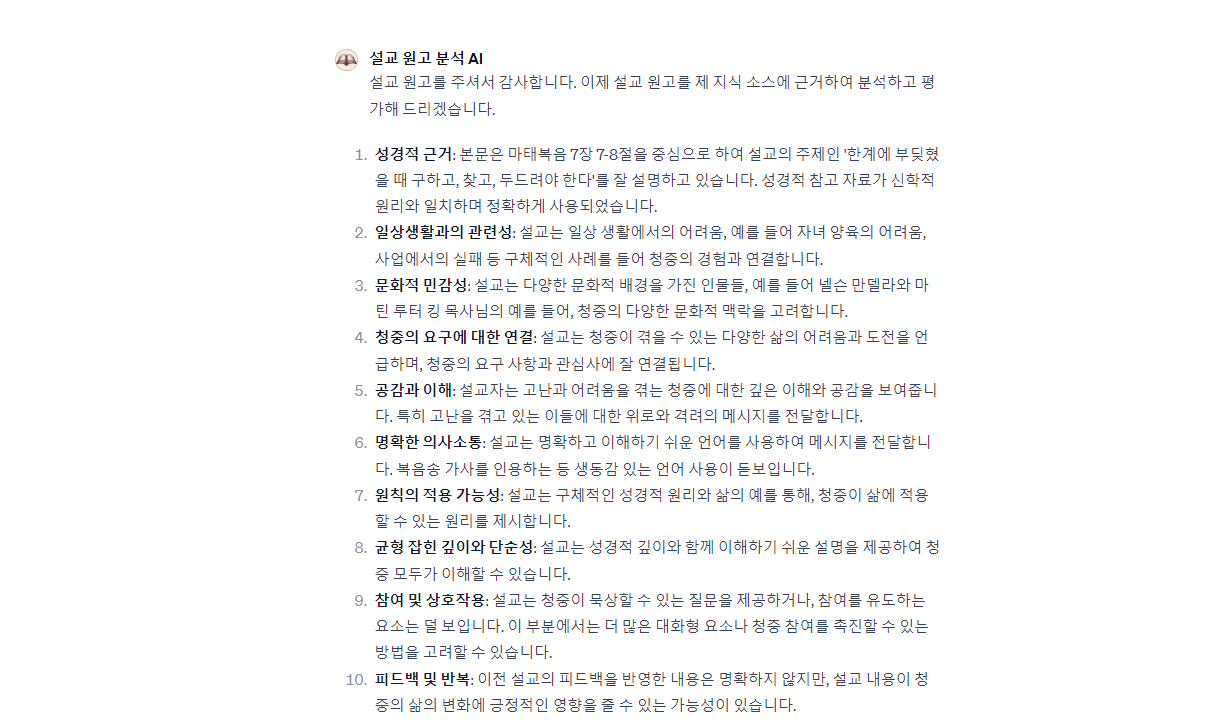 설교자가 원고를 입력하면 10가지 분야로 분석하여 제공합니다.