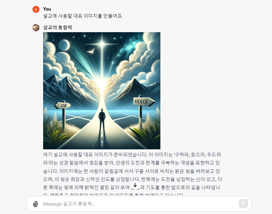 그리고 앞서 요청한 설교이미지를 요구했습니다. 그랬더니 아래와 같이 이미지를 만들어 주었습니다. 단락별로 필요한 이미지를 별도로 요구할 수 있습니다.