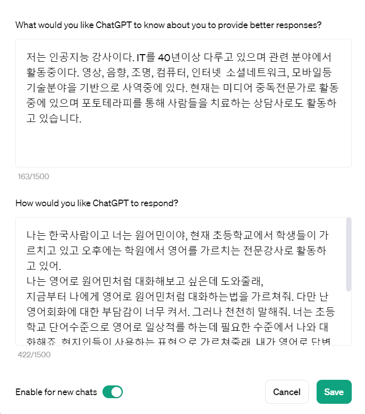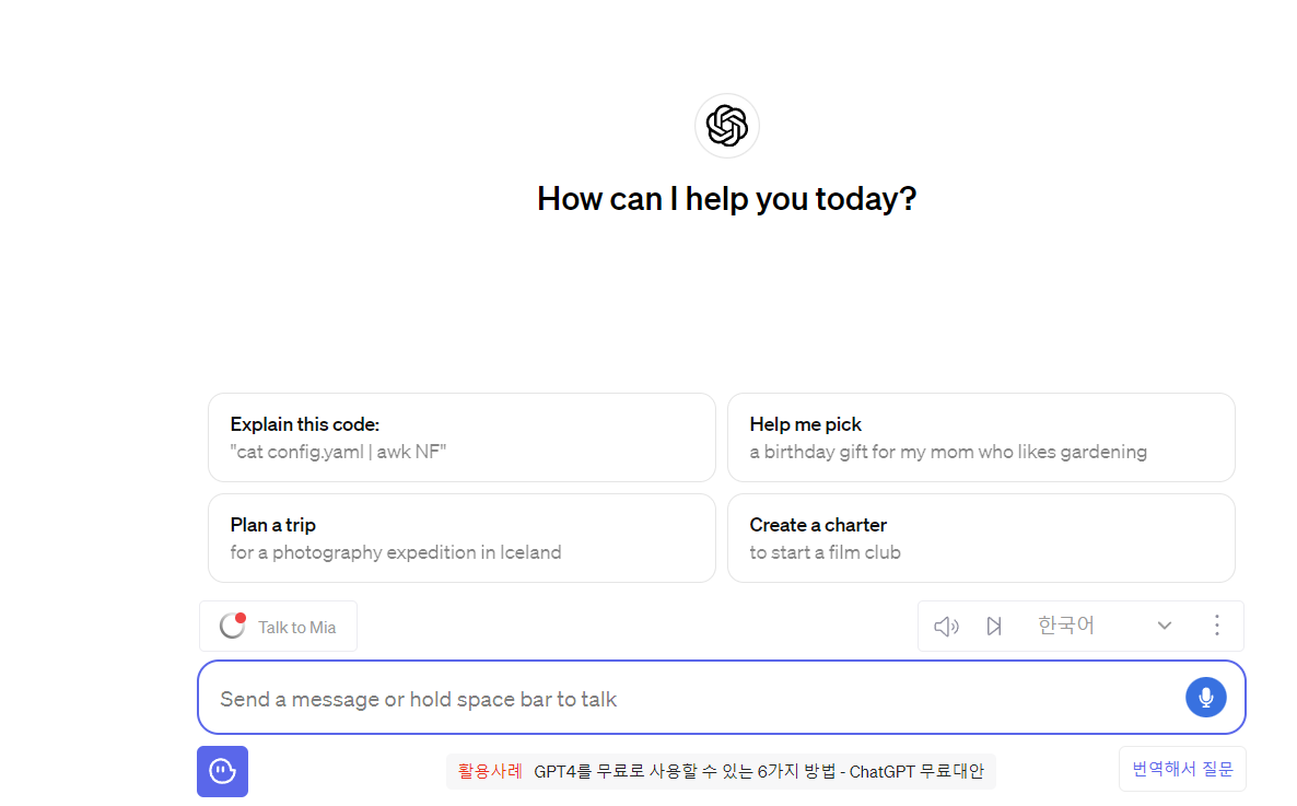 이 기능을 사용하면 외국인과 몇 시간씩 대화를 해도 무료로 회화를 할 수 있습니다 프롬프트를 이용하면 하지 않고 사용하는 것보다 더욱 효과적으로 대화할 수 있습니다. 예를들면 내가 말하면 인공지능이 답하게 하거나 반대로 할 수 있으며 더욱이 상호작용하면서 대화를 할 수 있다는 점에서 매우 좋은 기능입니다. 상호작용을 하려면 인공지능에게 번갈아 가면서 대화하자고 조건을 붙여넣으면 됩니다.
