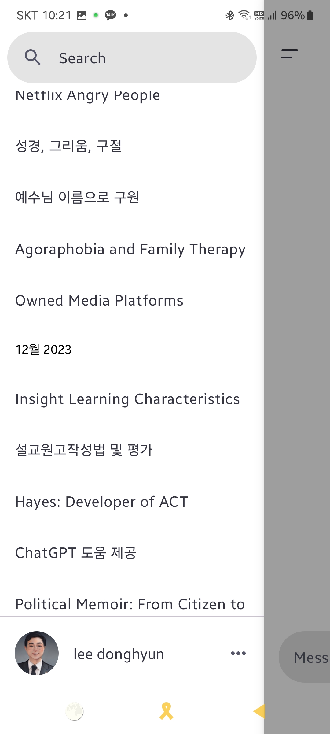 좌측 상단메뉴을 누른 후 자신의 얼굴이나 이름(아이디)옆에 점 3개를 누르면 설정화면으로 들어갑니다.