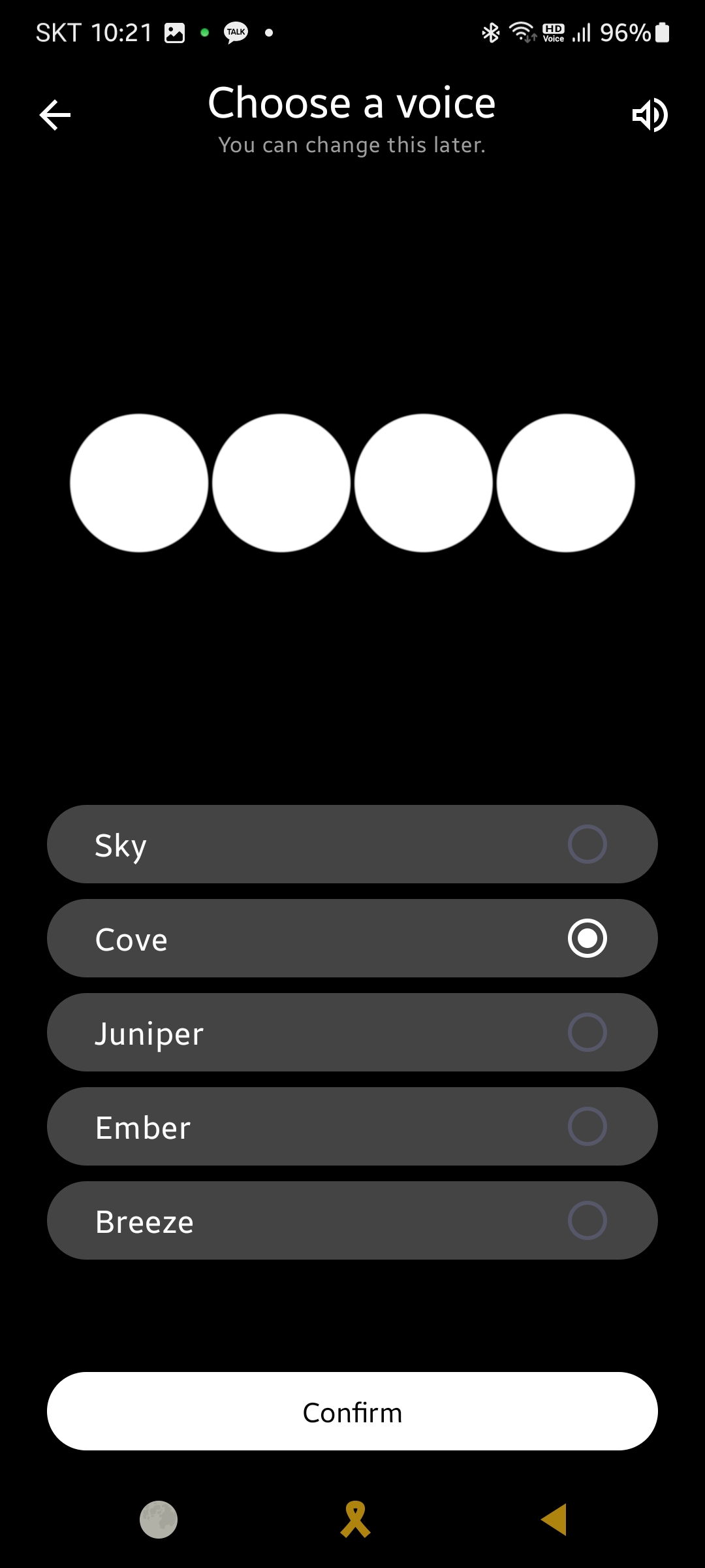 그곳에서 스피치 메뉴아래에 보이스가 있습니다. 보이스 메뉴를 누릅니다. 그런 후 5명의 사람들이 있어요. sky, cove, juniper, ember, breeze 중에서 선택합니다. 듣어보시고 자신과의 대화상대로 좋은 인공지능 목소리를 선택하세요. 선택후 아래에 컨펌을 누르면 됩니다.