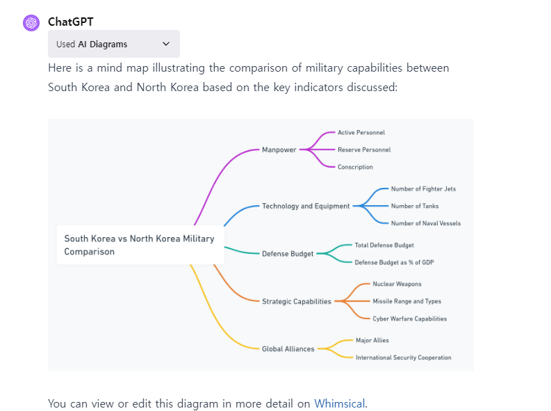 그렇게 설치후에 챗gpt에게 질문을 하면 지금까지 듣었던 결과와 다른 값을 제공합니다. 한 번 보시죠. 필자는 남한과 북한의 군사력을 비교해죠라고 했습니다. 그 결과값은 아래에 있습니다.