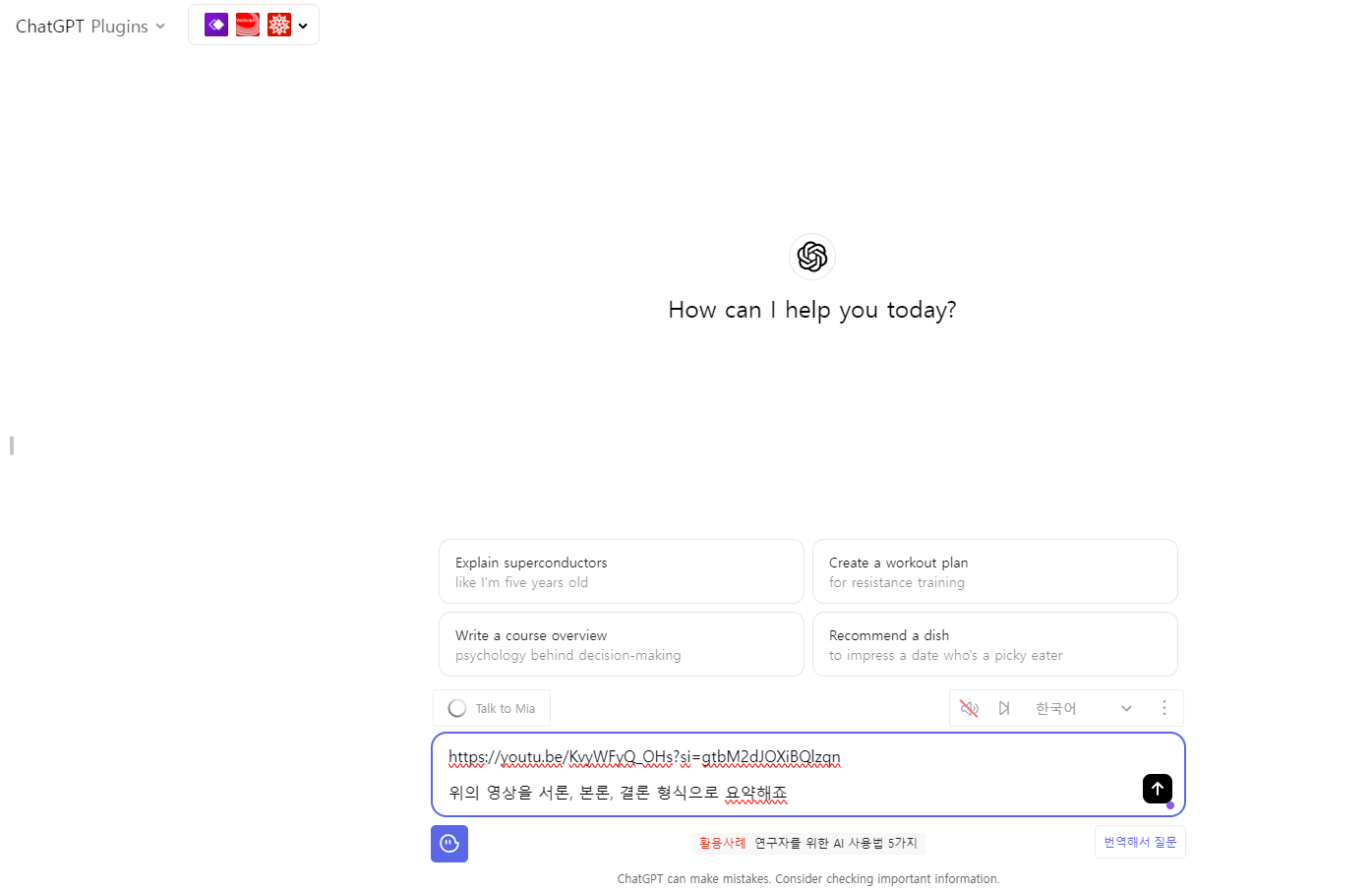 챗gpt로 가서 위의 링크 주소를 붙여넣기 합니다. 그리고 나서 이 영상의 내용을 요약하되 서론, 본론, 결론 형식으로 요약해죠 아니면 글머리 기호를 사용하여 요약해죠라고 합니다. 서론, 본론, 결론 형식으로 요약해죠라고 명령하겠습니다.