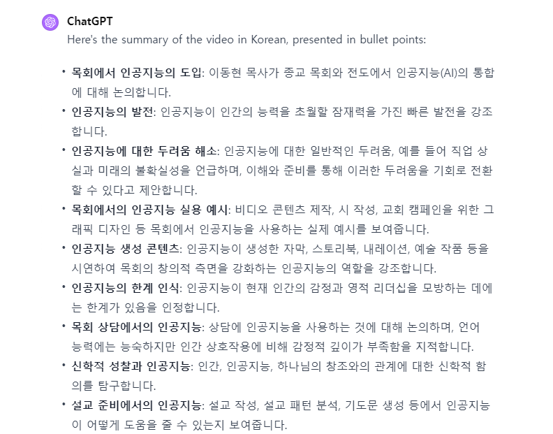 - 비디오는 이동현 목사가 AI를 위협이 아닌 지혜롭게 사용할 때 교회와 그 사명에 크게 이익이 될 수 있는 도구로 볼 것을 청중에게 권장하며 마무리합니다.