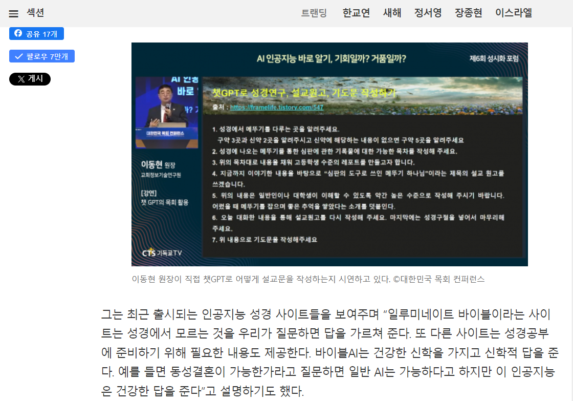- 목회자들의 AI 활용: 이동현 원장(교회정보기술연구원)은 챗GPT의 목회적 활용 방안을 제시했습니다. AI는 설교문 작성, 행정업무, 미디어 콘텐츠 생성 등에서 목회자들을 도울 수 있습니다. 그러나 이는 단순한 편의를 넘어, 교인들과의 소통과 섬김을 위한 도구로 활용되어야 합니다.