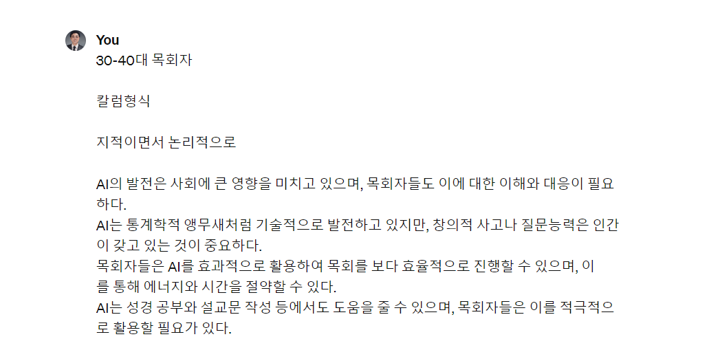 결론: AI 시대는 목회자들에게 새로운 도전이자 기회입니다. 기술의 발전은 우리에게 많은 가능성을 열어주지만, 그 본질은 여전히 인간의 손에 달려 있습니다. 목회자들은 AI를 단순한 도구로 보는 것이 아니라, 이를 통해 더 깊은 영적 성찰과 교인들과의 소통을 이루어내야 할 것입니다. AI 시대를 맞이하여, 우리는 기술과 인간성 사이의 균형을 찾아가는 여정에 함께하고 있습니다.