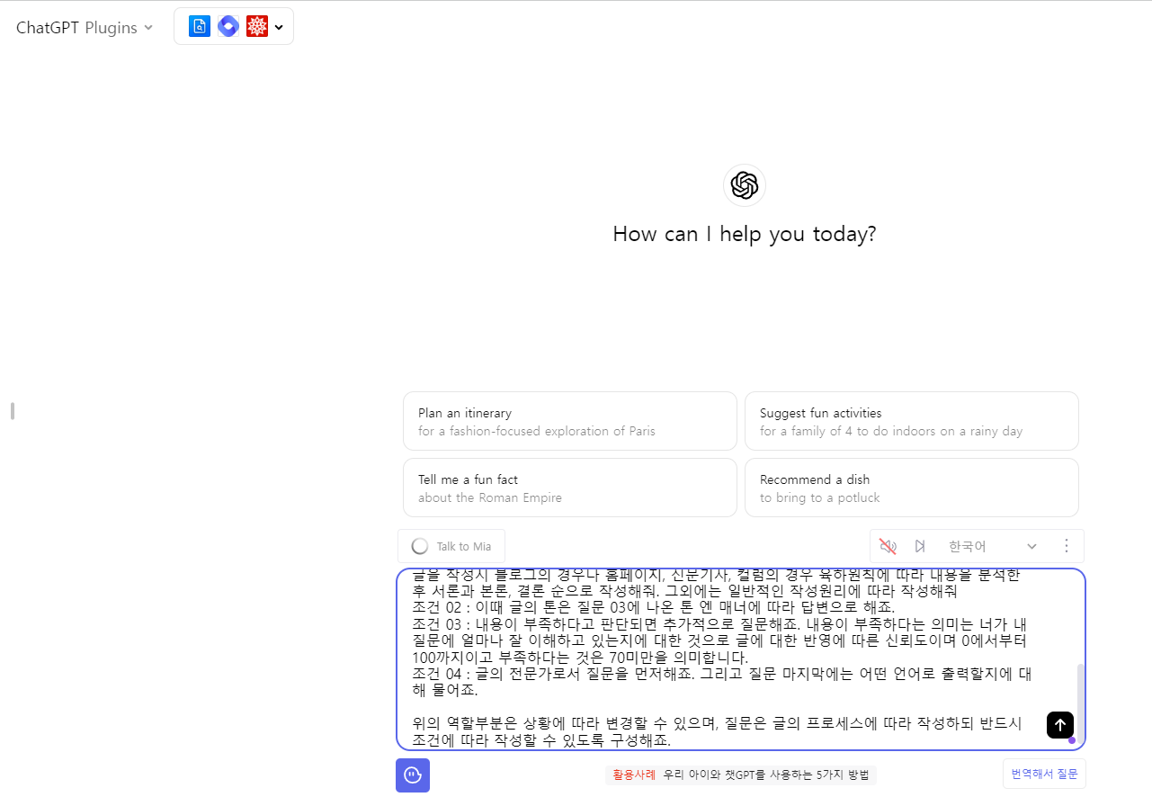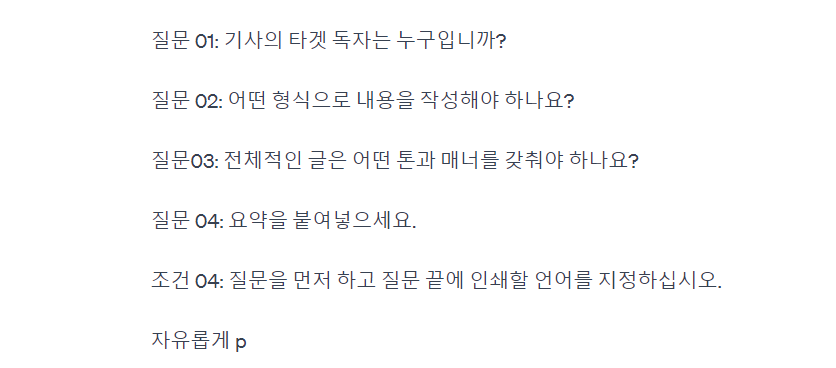 조건 04 : 글의 전문가로서 질문을 먼저해죠. 그리고 질문 마지막에는 어떤 언어로 출력할지에 대해 물어죠.