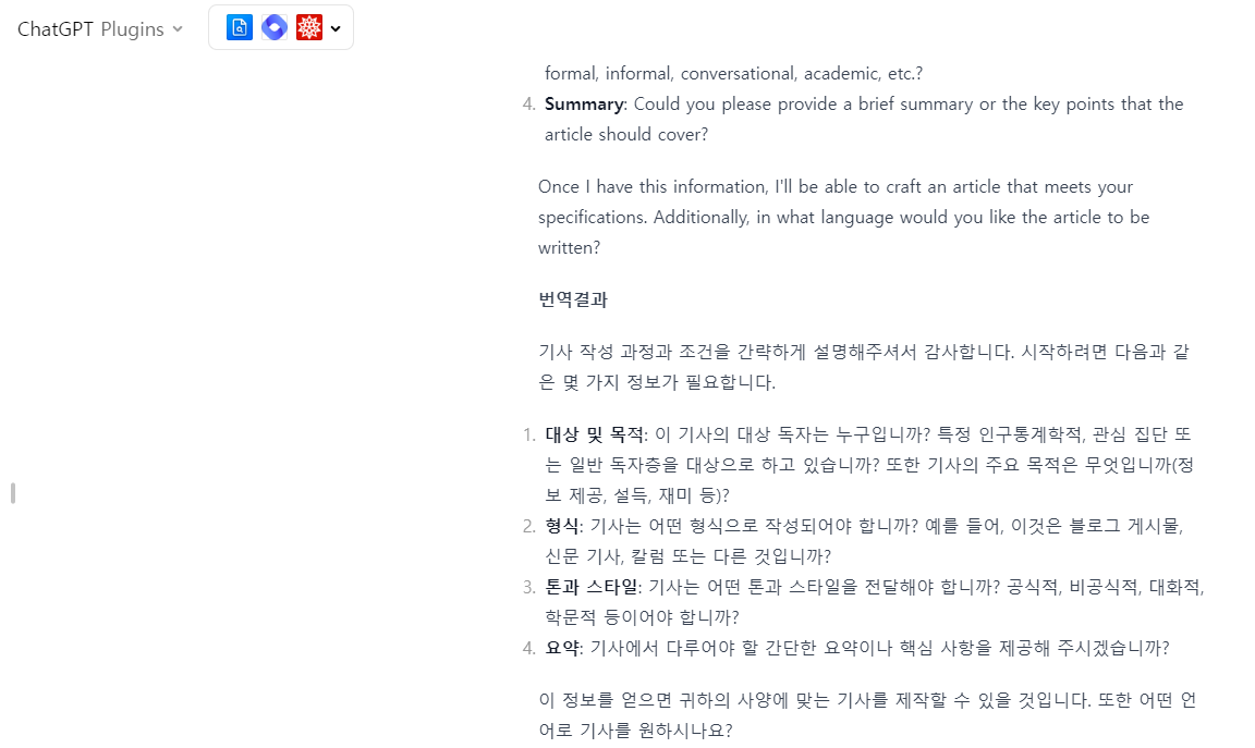 ** 지금까지는 챗gpt3.5 기준으로 작성된 글입니다. 과정은 생략하고 챗4.0과 플러그인을 사용하여 작성한 결과값을 보도록 하겠습니다.