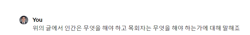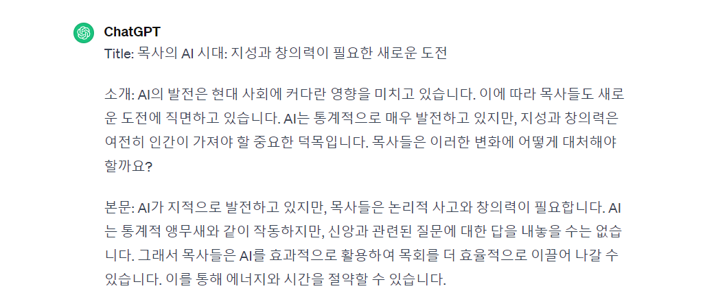 그러나 AI는 목사의 인간적인 역할을 완전히 대체할 수는 없습니다. 목사는 신앙 공동체를 이끄는 리더로서의 역할을 수행하며, 신앙과 관련된 질문에 대답하고, 사람들의 신앙 생활을 도와야 합니다. 이는 AI로 대체될 수 없는 인간적인 측면입니다.