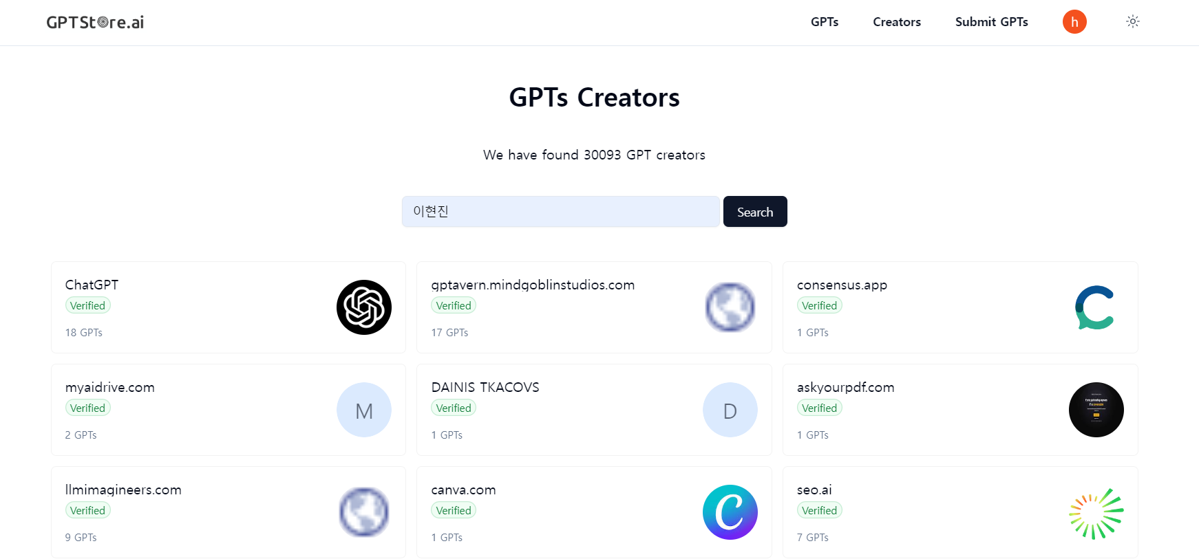 바로 https://gptstore.ai/ 이다. 이곳은 자신이 만든 앱들을 등록할 수 있고 다른 사람들에게 홍보할 수 있다. 해당 페이지에 들어가서 로그인한 후 자신이 제작한 것을 업로드하여 알릴 수 있다. 만약 아직 만든 것이 없다. 아래의 검색창을 통해서 찾아 보자.