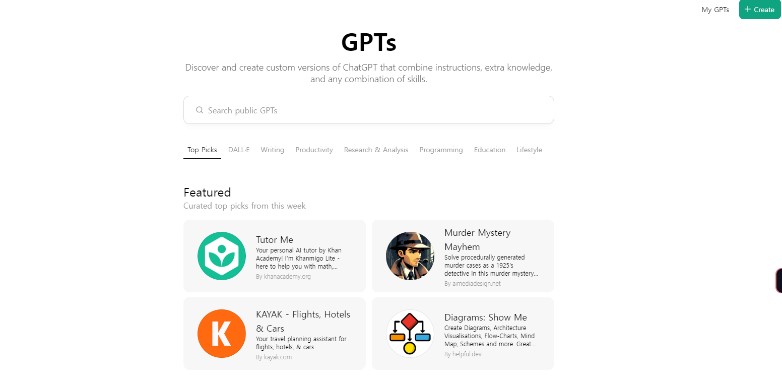 GPTs 스토어에 가면 인기있는 gpt들이 많다. 해당 gpt들을 눌러서 들어가면 어떤 서비스를 하는지 쉽게 알 수 있다. 그렇지만 약간의 불편함이 있다. 카테고리별로 제공하는 앱들이 제한적이다는 사실이다. 한국어로 표시해주는 것이나 내가 필요한 것중에 한국인들이 만들어 놓은 것을 찾는 것도 불편하다. 그래서 금번 포스트에서는 조금더 접근성이 좋고 관련 내용이 무엇인지, 어떤 서비스를 구체적으로 제공하는지에 대해 알 수 있는 곳을 소개하고자 한다