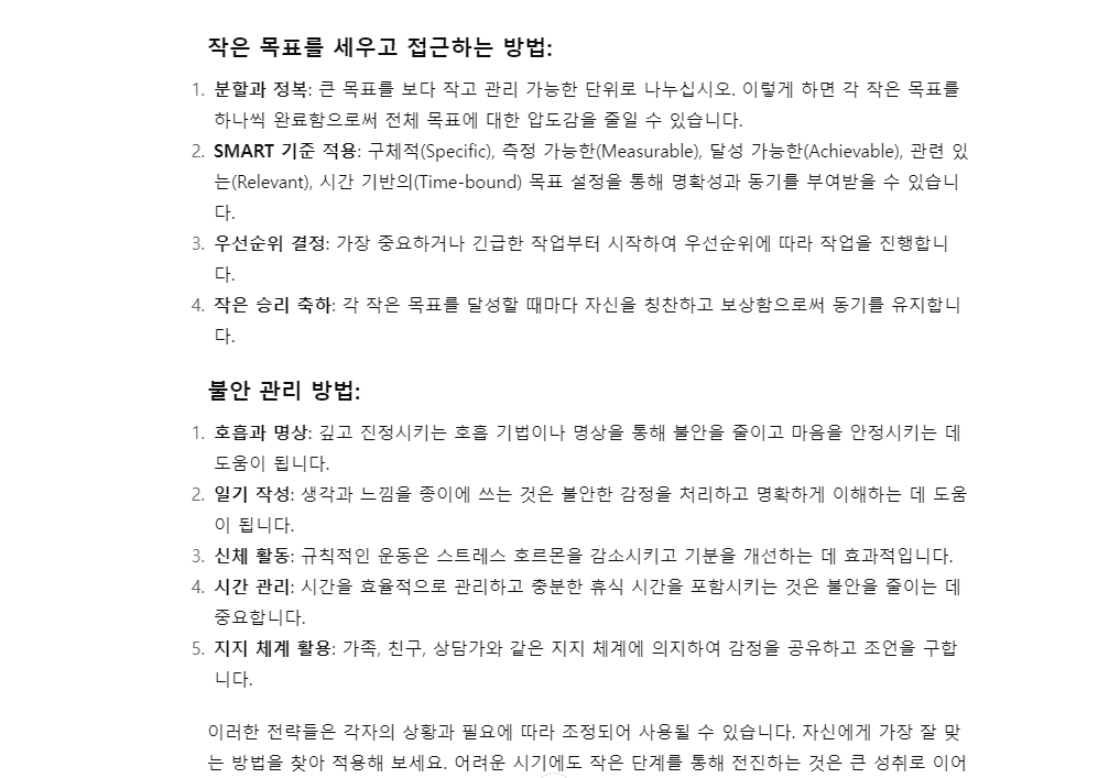 내담자가 자신의 문제을 해결하기 위해 자신이 해결해야 할 목표에 대해 어떻게 접근할 지, 불안을 관리해야 하는 방법에 대해 물어옵니다. 이에 인공지능은 아래와 같이 답변을 제공합니다.