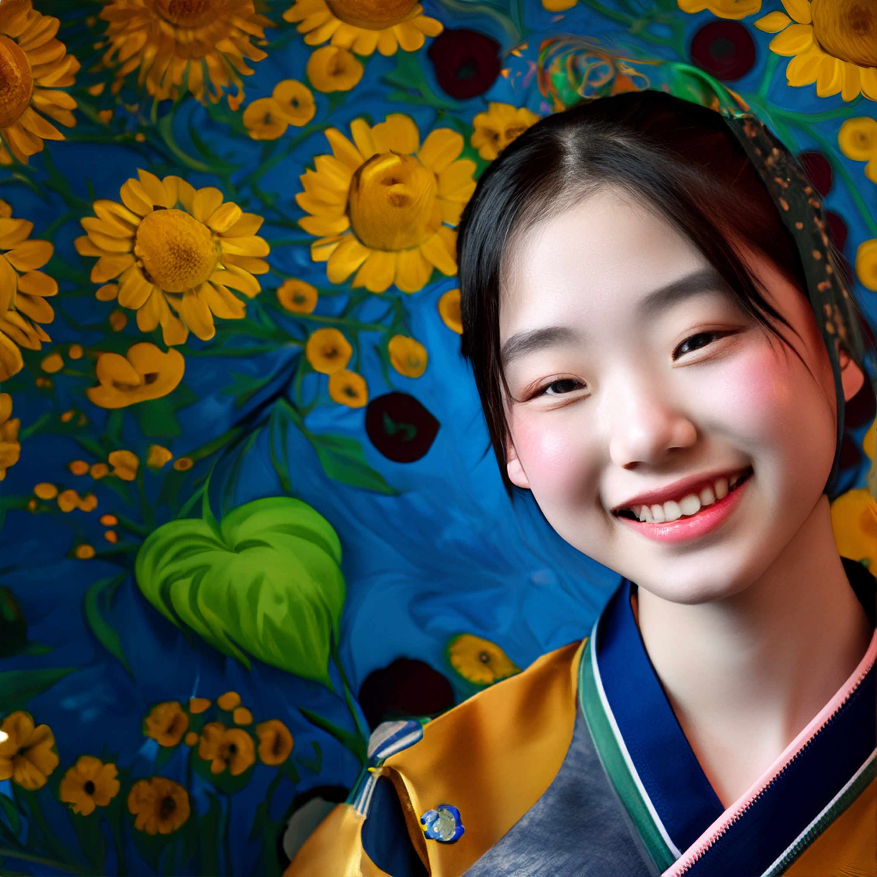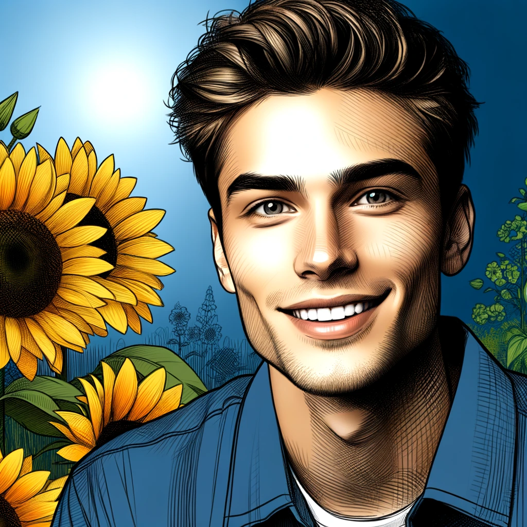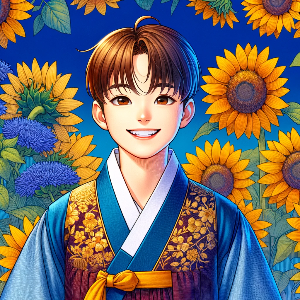 인공지능으로 그린 20대 여자이미지로 배경은 꽃 이미지로 만들어 달라고 요청한 이미지들입니다. 위의 이미지를 챗gpt를 통해 다시 그려달라고 요청했습니다. 요청시 여자가 아닌 남자로, 그리고 배경은 기존의 이미지(해바라기 배경)를 참조해서 그려달라고 했습니다. 그 결과 아래와 같이 그려졌습니다.