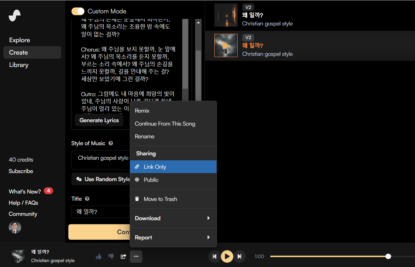 상단 좌측에 보면 create를 클릭하면 음악을 생성할 수 있다. 아래의 create가 보인다. 클릭한다. Custom Mode 클릭 → 데이터 입력 후 Create 버튼 클릭, Custom Mode에서는 Lyrics(가사), Style of Music(노래 스타일), Title(노래 제목)을 설정할 수 있다.