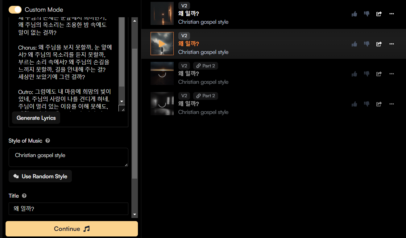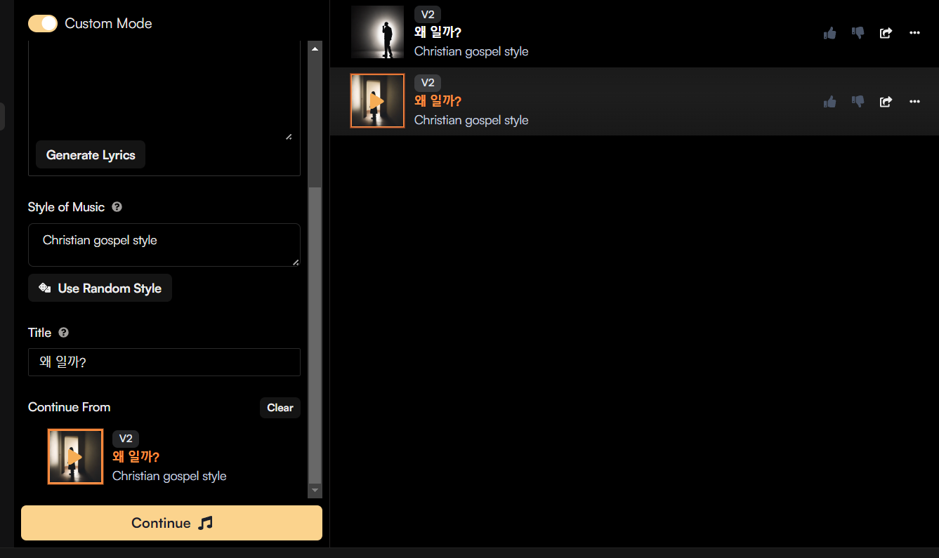 Continue From This Clip 옵션 선택 → 가사 입력 후 Continue(매우중요), Continue From This Clip 옵션에서는 원곡에 이어지는 1분 길이의 노래를 만들 수 있습니다.