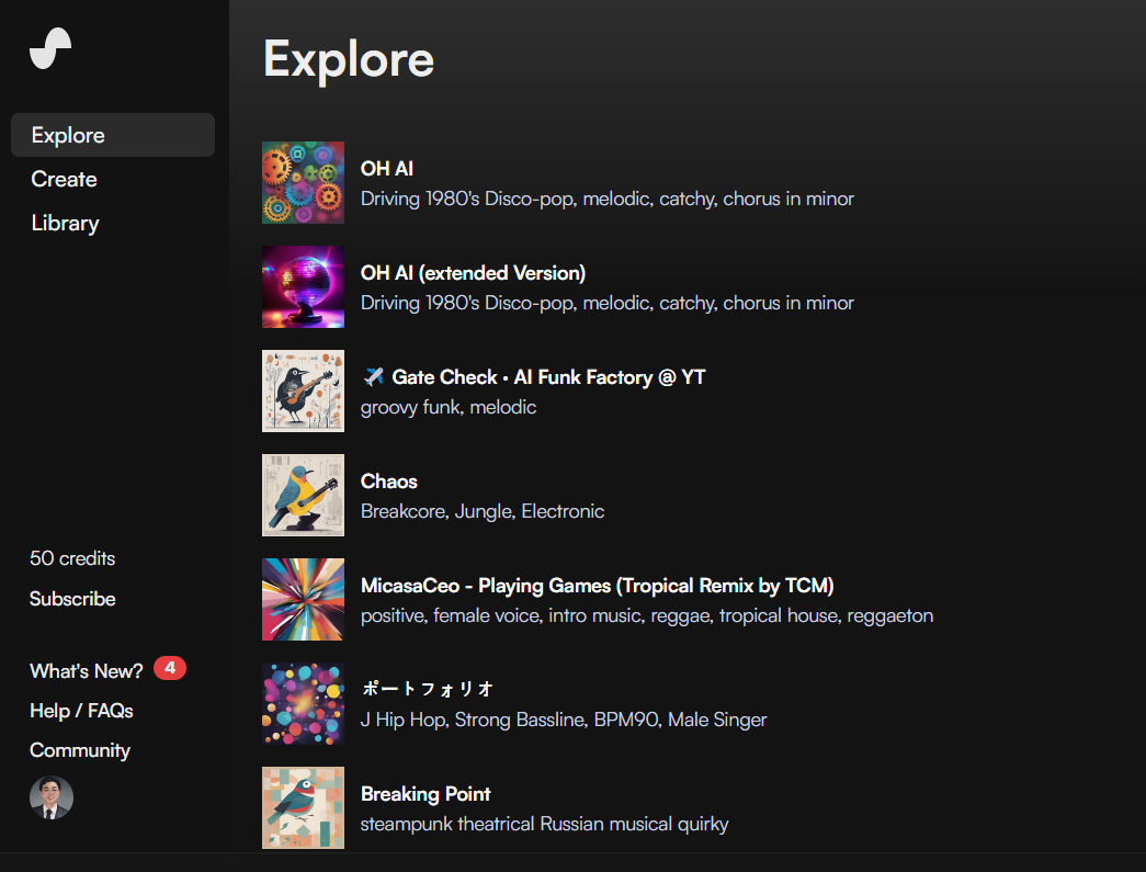 Suno AI을 통해 음악을 만들 수 있다. 노래의 분위기나 주제를 알려주거나 가사를 입력하면 자동으로 음악을 만들어준다. 한 번에 최대 1분 20초 길이의 노래를 만들 수 있으며, 노래의 끝에 1분 길이의 새로운 파트를 추가하는 방식으로 길이를 늘려나갈 수 있다. 장점은 외국서비스이지만 한글이 지원되기 때문에 작업하는데 특별한 문제가 없다.