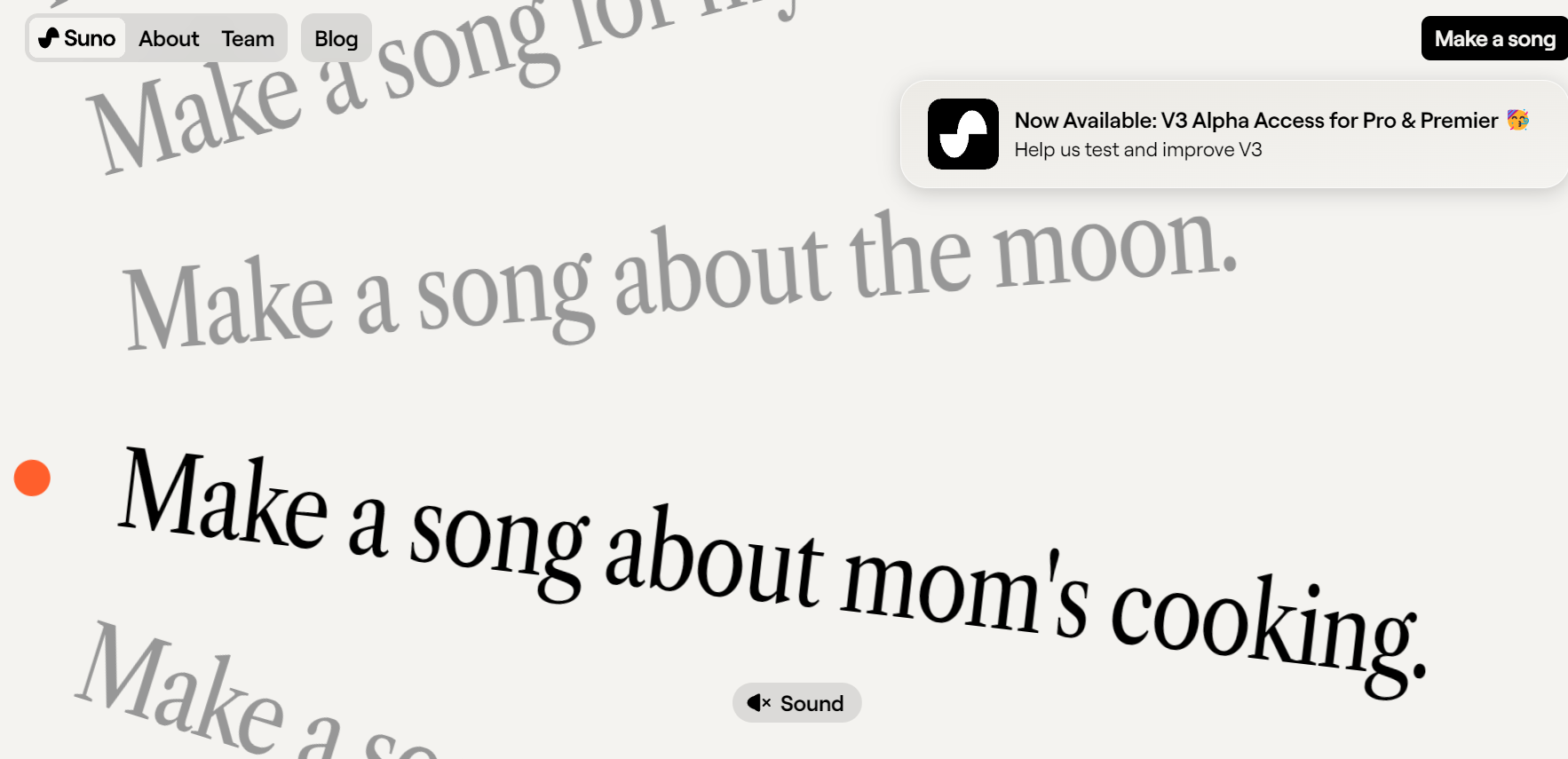 필자가 입력한 내용을 통해 원하는 곳을 만들수 있다. make a song 버튼을 누르면 인공지능 음악을 만들수 있다. 홈페이지 좌측 하단 Sing Up 버튼을 클릭해서 계정을 생성할 수 있다.
