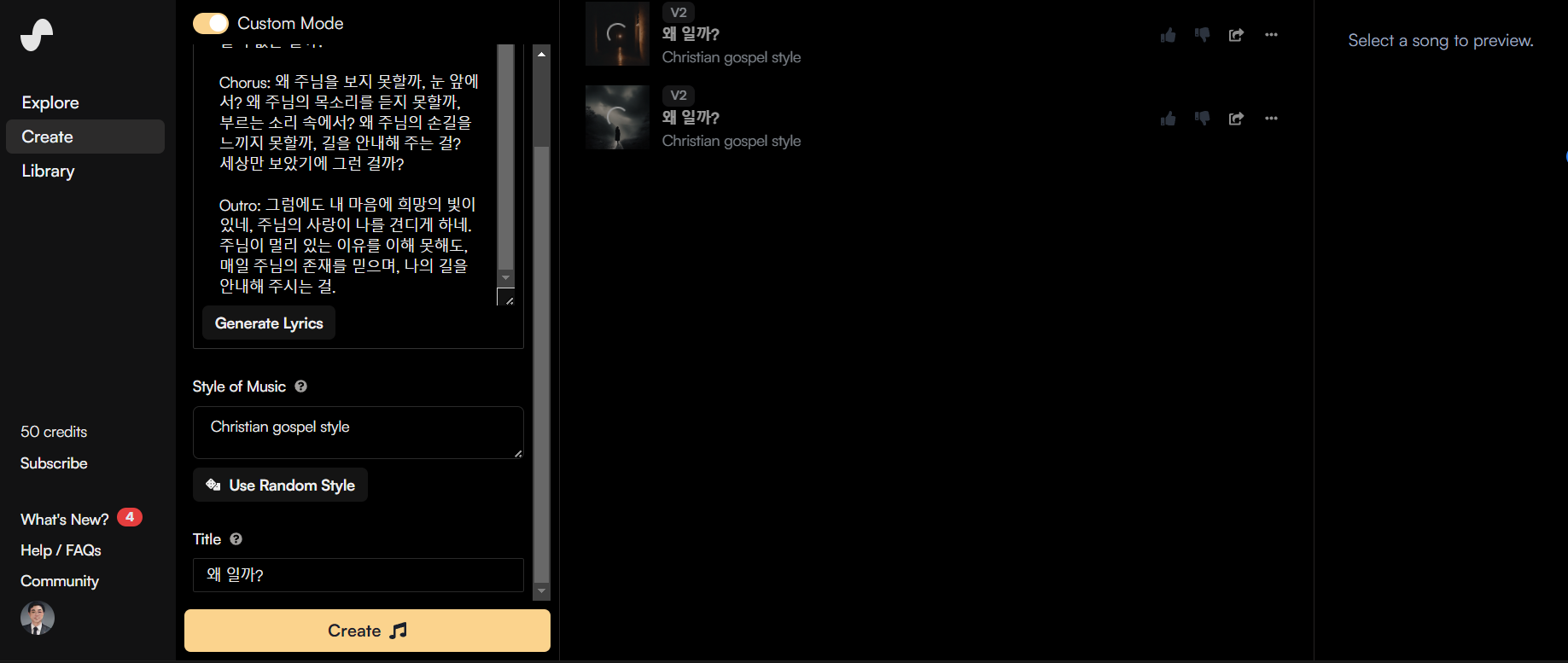 필자 가사는 챗gpt를 통해 만들었고, 노래제목과 가사를 복사한 후 이곳에 붙여넣기 한다. 그리고 노래의 장르는 CCM스타일로 생성한다. 가사를 입력한 후 Create 버튼을 눌러서 음악을 생성해보았다.