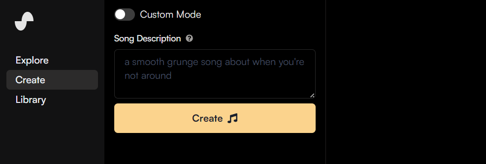 상단 좌측에 보면 create를 클릭하면 음악을 생성할 수 있다. 아래의 create가 보인다. 클릭한다. Custom Mode 클릭 → 데이터 입력 후 Create 버튼 클릭, Custom Mode에서는 Lyrics(가사), Style of Music(노래 스타일), Title(노래 제목)을 설정할 수 있다.