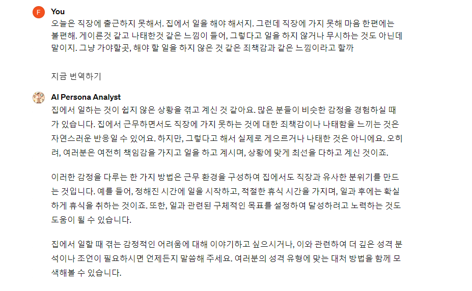 자신이 생각하고 있는 생각이나 느낌에 대해 입력합니다. 필자가 입력한 후 인공지능 상담사는 아래와 같이 답변을 했습니다. 참고만하세요.특별히 검사한다고 생각하지 마시고 대화한다고 생각하면서 인공지능이 질문하면 답변하는 형태로 진행하면 되도록 구성해 놓았습니다.