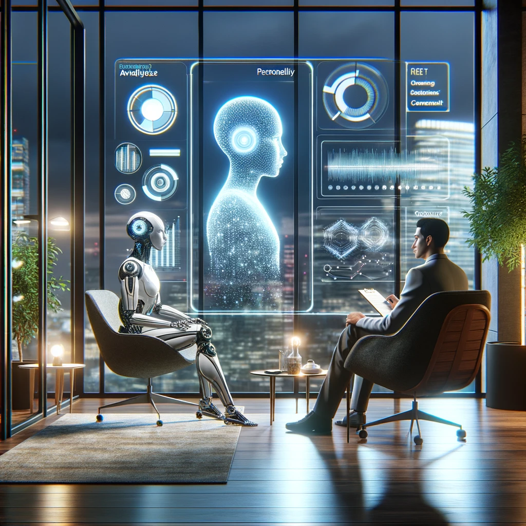 I've created an image depicting a futuristic setting where an artificial intelligence designed for personality analysis is engaging in a counseling session with a human. The scene is set in a modern, sleek office with a holographic interface and ambient lighting, showcasing the interaction between human and AI amidst an advanced city skyline.