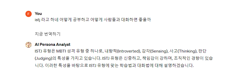 이상과 같이 인공지능 성격분석 상담사를 통해 내담자와 대화하는 과정을 통해 다양한 검사를 진행할 수 있도록 개발하였습니다. 기본적인 디스크검사, MBTI검사, 애니어그램검사, 직업유형검사, 다중지능검사, TCI성격검사등을 할 수 있도록 하였으며, 나아가 이를 기반으로 학습방법과 대화법까지 상담할 수 있도록 제작해 보았습니다.