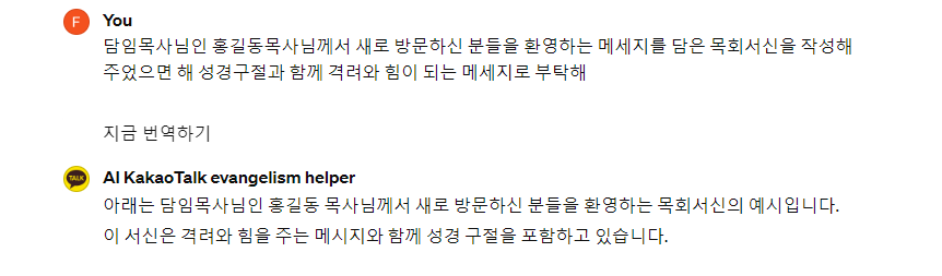 다음으로 담임목사가 새로오신 분들에게 환영메세지를 보낸 내용이다. 핵심키워드만 입력하면 마음에 와닫는 메세지가 작성된다.