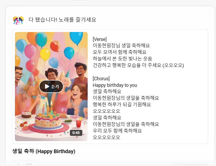 suno 앱이 실행된 후 프롬프트창에 위의 내용을 입력했다. 잠시만 기다리면 아래의 같은 노래가 나온다.