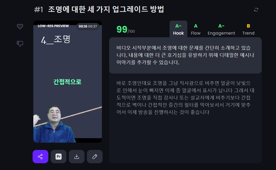 오퍼스 클립이라고 하는데 영어로 되어 있지만 한글로 번역해 주기 때문에 사용하는데에는 별문제가 없다. 유튜브 링크나 영상파일을 넣어서 유튜브 쇼츠를 만들어 준다.