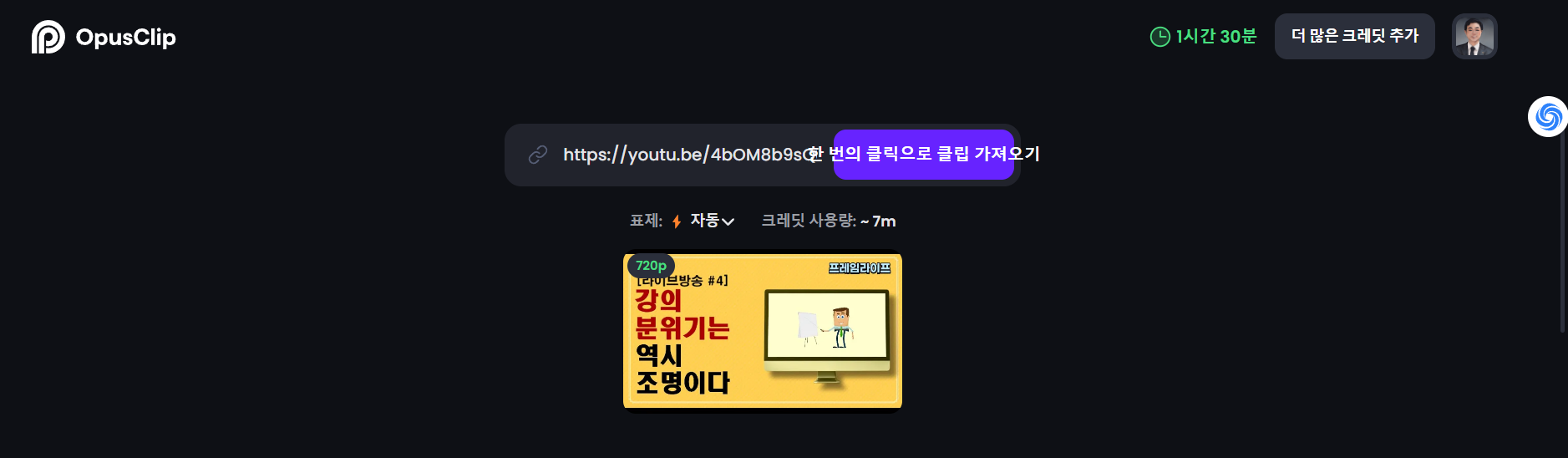 사용하기 위해서는 먼저 구글 계정으로 로그인하면 된다. 오퍼스는 90분정도 무료로 제공해 주는데 자신이 가지고 있는 영상이나 링크 주소가 긴 영상을 짤라주어야 한다. 필자는 아래의 주소를 넣고 쇼츠를 만들고자 한다.