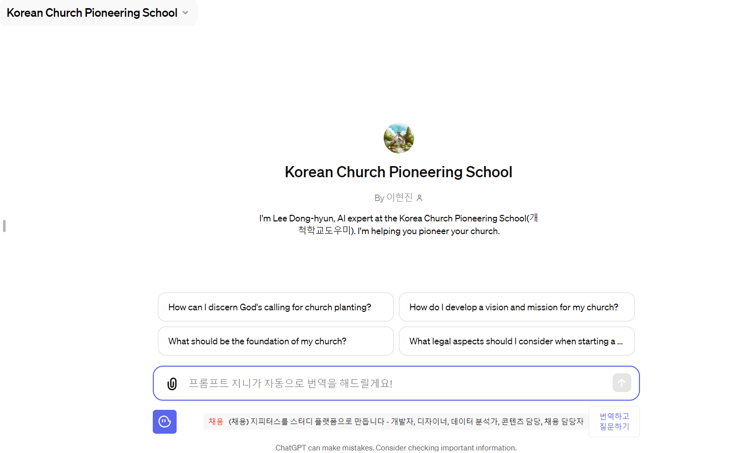 I'm Lee Dong-hyun, AI expert at the Korea Church Pioneering School(개척학교도우미). I'm helping you pioneer your church.