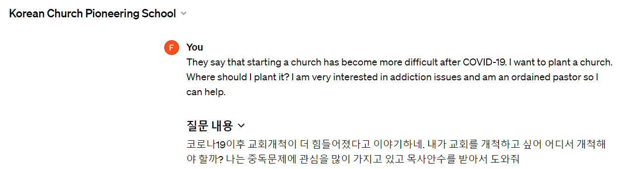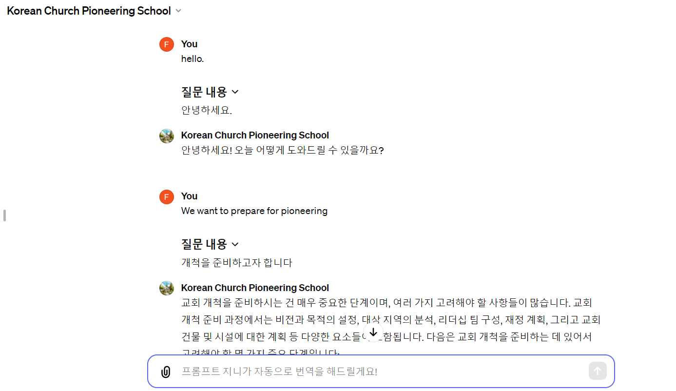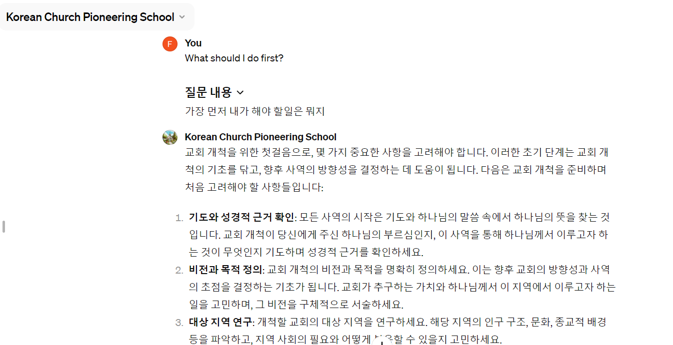 이상과 같이 교회개척학교 도우미를 통해 교회개척에 필요한 사전 준비에 대한 정보를 요청하거나 상담을 통해 교회개척을 도울 수 있는 인공지능을 제작해 보았습니다. 수십페이지의 사전학습파일과 구조등을 통해 사용자들이 손쉽게 개척을 준비하는데 도움을 제공하고자 제작하였습니다.