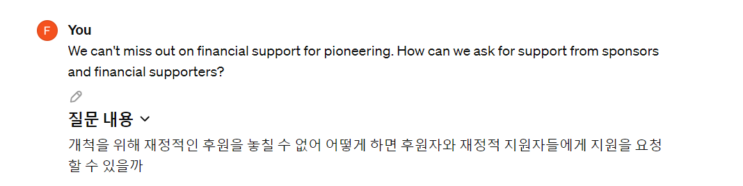 재정 계획과 준비: 교회 개척과 운영을 위한 재정적 준비가 필요합니다. 예산 계획을 세우고, 필요한 자금을 어떻게 조달할 것인지 계획하세요. 후원자 찾기, 자금 모금 계획 등을 포함할 수 있습니다.
