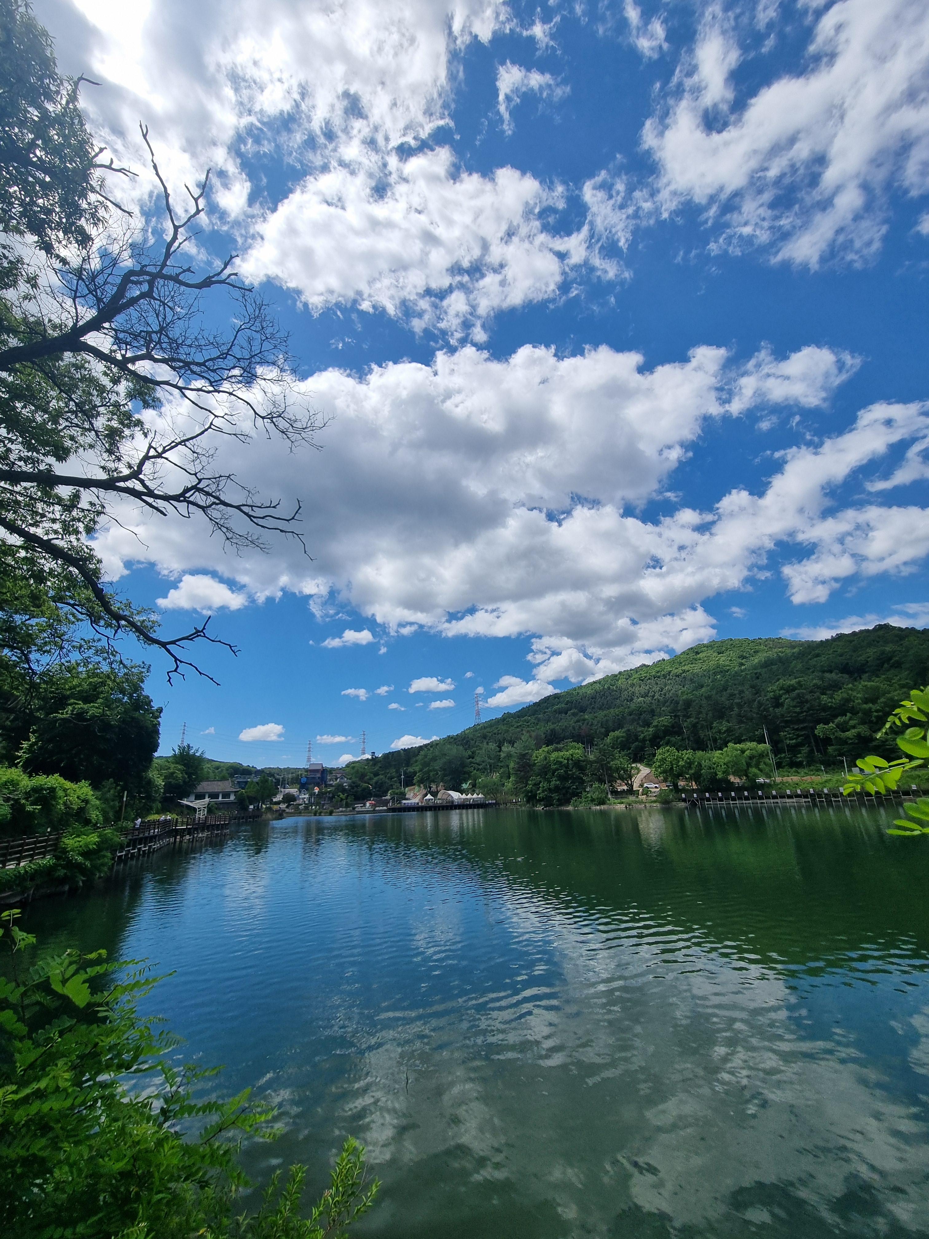 고모리 호수 초입. 우측편에 차를 주차하고 이곳에 와서 일정을 시작했다. 하늘엔 뭉개뭉개 구름들이 나를 반긴다.