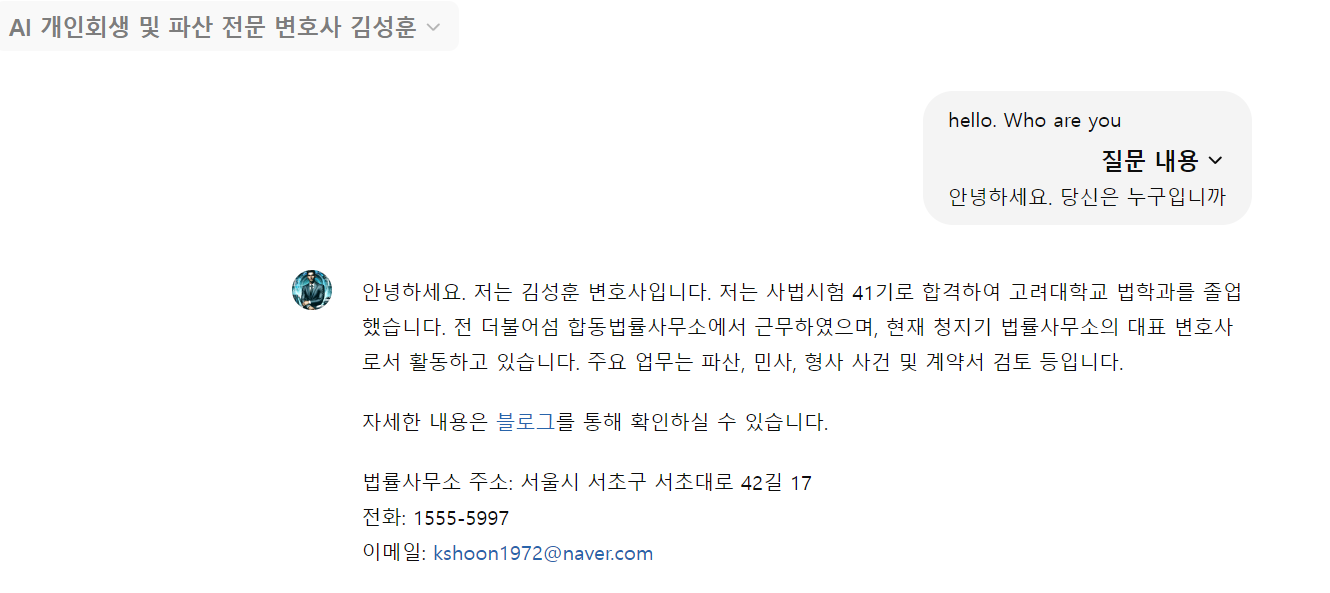 인공지능 챗봇 변호사이지만 실질적으로 인간을 도와줄 수 있는 인간변호사에 대해 확인해 볼 필요가 있다. 단순히 관련 법류나 프로세스만 넣어서 도움을 준다는 인공지능 변호사는 얼마든지 많다. 그렇기 때문에 전문 인간 변호사가 운영하는 변호사 챗봇을 이용하는 것이 중요하다. 위의 링크를 보면 블로그와 전화번호, 그리고 이메일등이 존재한다. 챗봇을 통해 운영자를 확인한 후 실질적으로 운영하는 변호사 사무실인지 확인할 필요가 있다.
