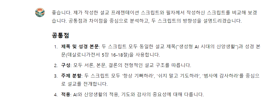 필자께서 작성하신 스크립트는 보다 구체적이고 실질적인 예시와 사례를 통해 청중에게 명확한 메시지를 전달하는 데 중점을 두고 있습니다. 반면에, 제가 작성한 스크립트는 기본 원칙과 일반적인 조언을 통해 청중이 AI 시대에서도 신앙을 유지할 수 있도록 돕는 데 중점을 둡니다. 두 스크립트 모두 각각의 장점이 있으므로, 필자의 구체적인 예시와 제 스크립트의 일반적인 조언을 결합하면 더욱 효과적인 설교 프레젠테이션을 만들 수 있을 것입니다.