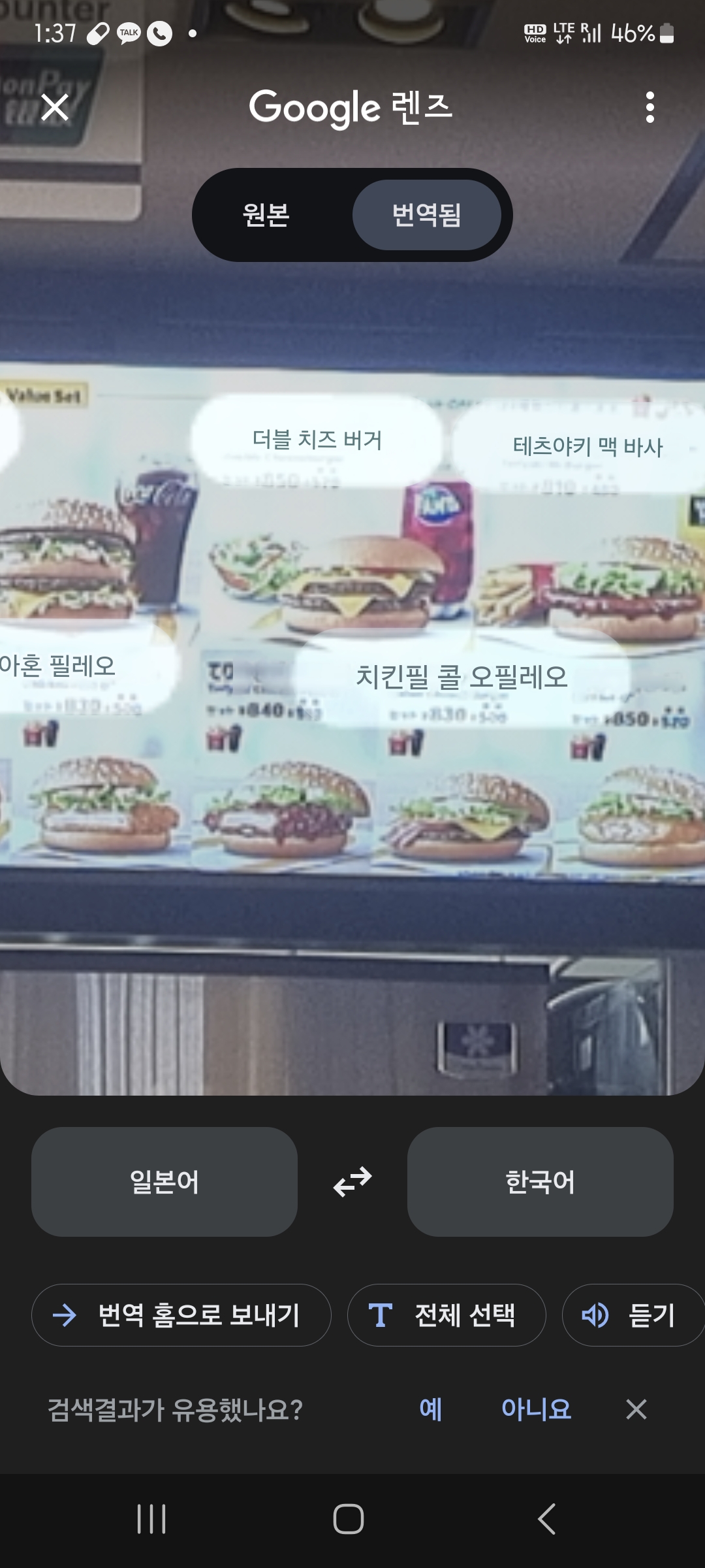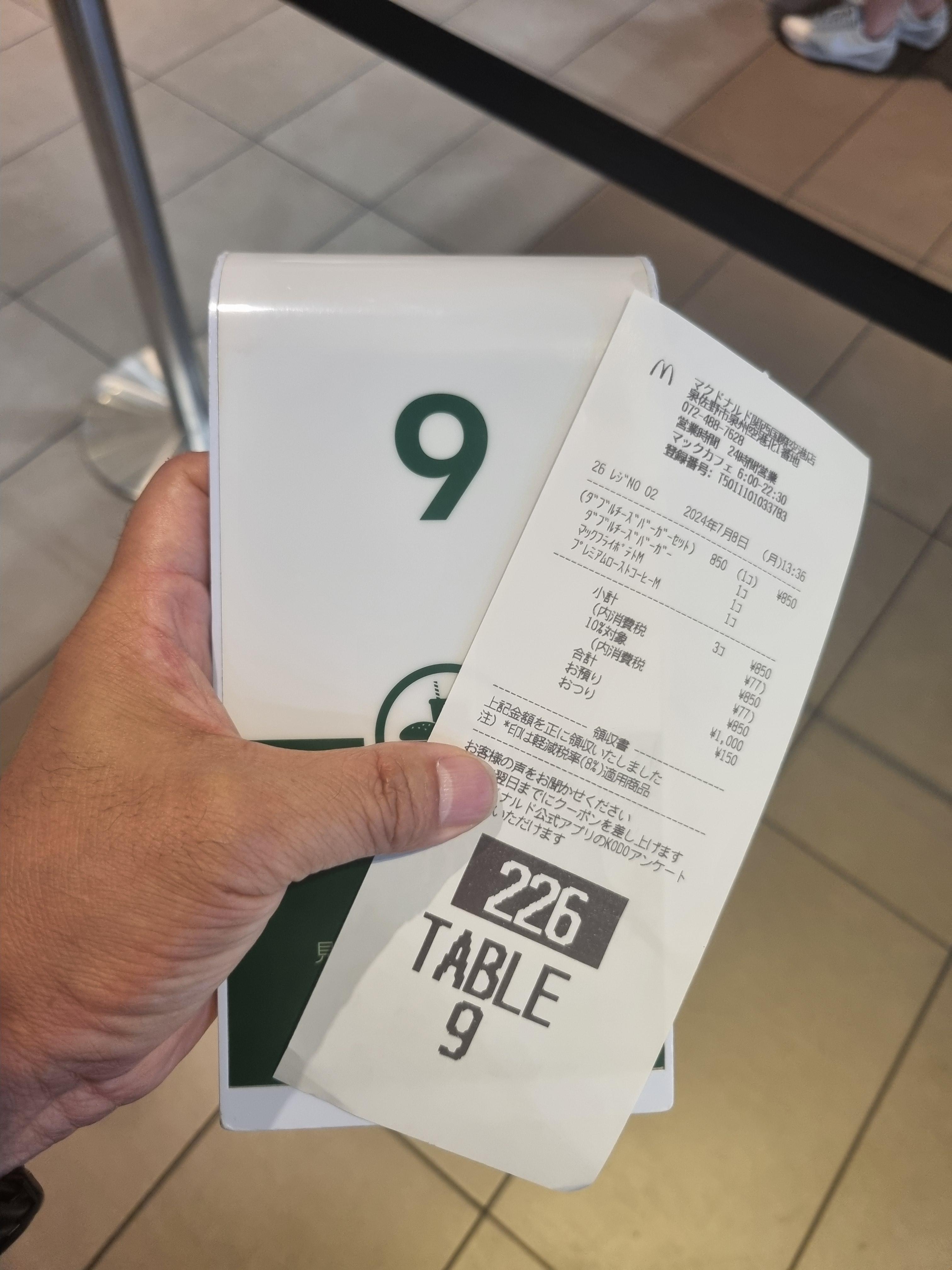 일본어를 모르는 내 입장에서 먹기는 먹어야 했기에 구글렌즈를 통해 먹고 싶은 제품을 선택했다. 그리고 엔화로 지불한 후에 번호판을 받고 테이블로 이동하니 내가 주문한 음료와 햄버그를 가져왔다.
