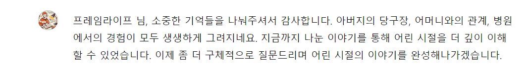 이 질문들을 통해 어린 시절을 좀 더 구체적으로 그려보려 합니다. 편하게 이야기해 주시면 됩니다. 질문과 답변을 하는 동안 자서전 전문가는 글을 구성한 후 독자가 요구할 때 해당 부분에 대해 글의 내용을 제시합니다.