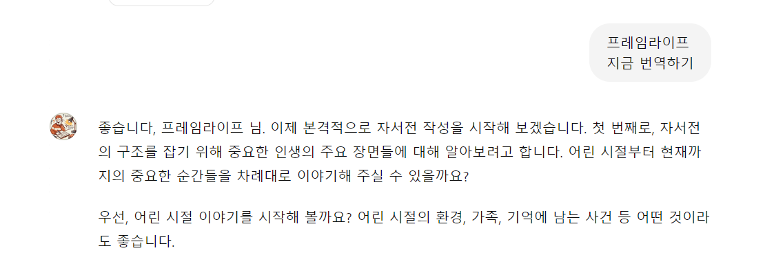 자서전전문가에게 필명을 말하면 답변시 필명의 이름을 거론 한 후 자서전 작성을 하겠다고 하면서 몇 가지 질문을 하기 시작합니다. 질문에 대해 성실히 답하시면 됩니다. 만약 질문에 대해 거부감이 들거나 다른 주제로 이야기 하고 싶으면 프롬프트창에 독자여러분들의 생각을 입력하면 됩니다.
