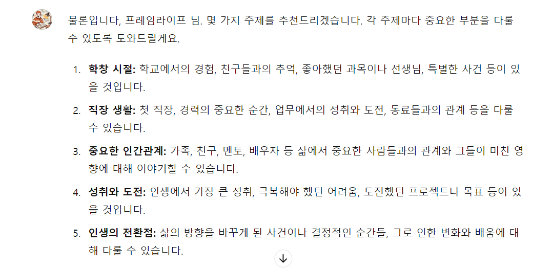 무슨글을 적어야 할지 어떻게 글을 시작해야 할지 모를 때 자서전 전문가에게 질문을 요청합니다. 그러면 새로운 질문이 나옵니다. 프롬프트창에 다른 주제을 추천해 달라고 요청합니다. 그러면 아래의 내용처럼 주제에 대한 내용을 말하면 자서전 전문가가 다시 질문을 하기 시작합니다.