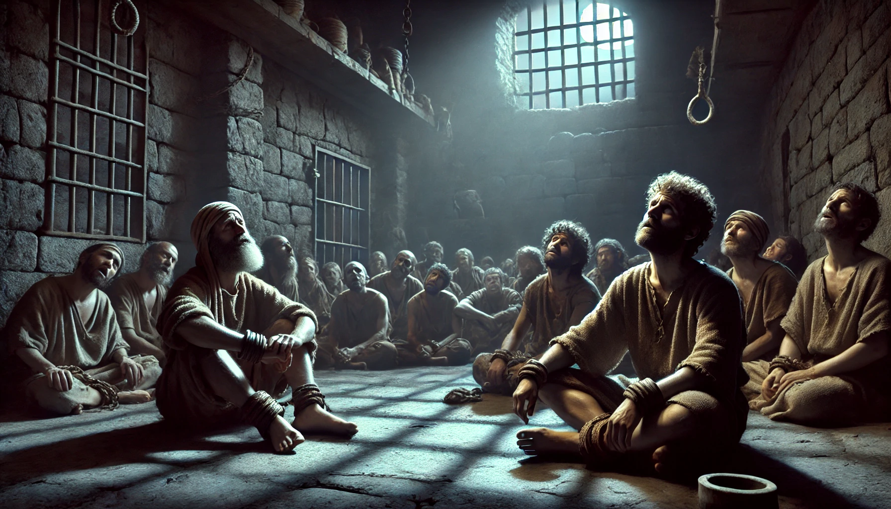 나는 그들을 오물과 절망의 냄새가 풍기는 어둡고 축축한 구덩이인 가장 안쪽 감방으로 인도했습니다. 벽은 차가운 돌로 되어 있었고, 유일한 빛은 위쪽에 있는 작은 창살 창을 통해서만 들어왔습니다. 다른 죄수들, 완고한 사람들은 동정심과 즐거움이 섞인 눈으로 바울과 실라를 바라보았습니다. 나는 그들의 발에 차꼬를 채워서 그들이 움직이지 못하도록 했습니다.