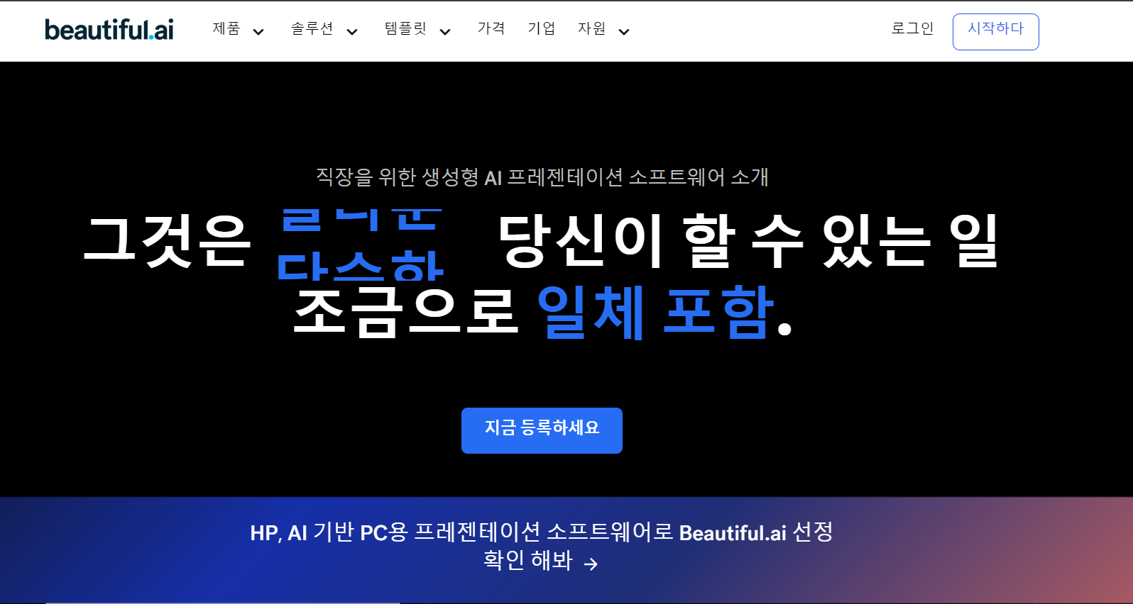 Beautiful.ai는 사용자가 전문가 수준의 슬라이드를 빠르고 효율적으로 만들 수 있도록 설계된 인공 지능 기반 프레젠테이션 도구입니다. 이 플랫폼은 AI를 활용하여 디자인 프로세스를 자동화하여 각 슬라이드가 시각적으로 매력적인 도구입니다. 유료사용자들을 위한 인공지능 프레젠테이션이라고 보면좋을 듯 합니다. 14일간 무료로 사용하다가 유료로 전환됩니다.