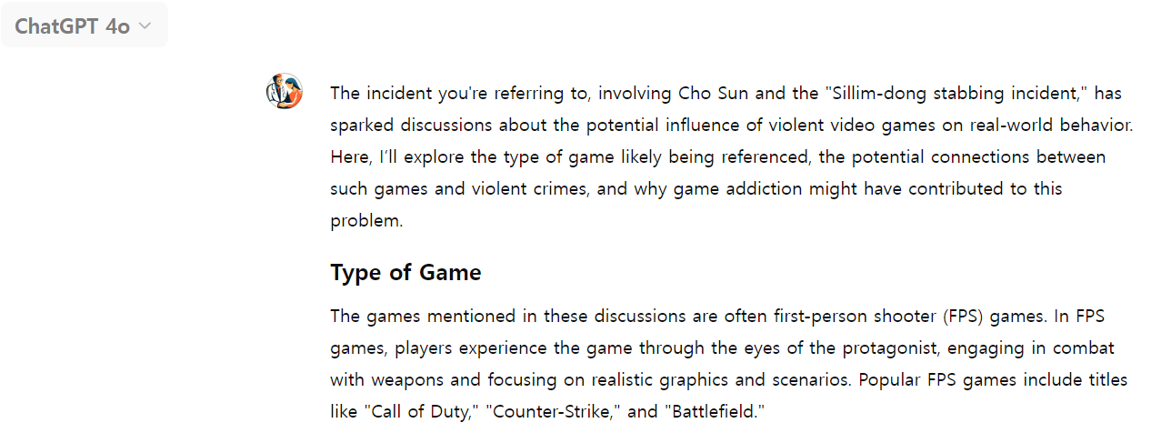 중독전문가 : '신림동 칼부림 사건'과 관련된 당신이 언급한 사건은 폭력적인 비디오 게임이 실제 행동에 미치는 잠재적 영향에 대한 논의를 촉발시켰습니다. 여기에서는 언급될 가능성이 있는 게임 유형, 그러한 게임과 폭력 범죄 사이의 잠재적 연관성, 게임 중독이 이 문제에 기여한 이유를 살펴보겠습니다.