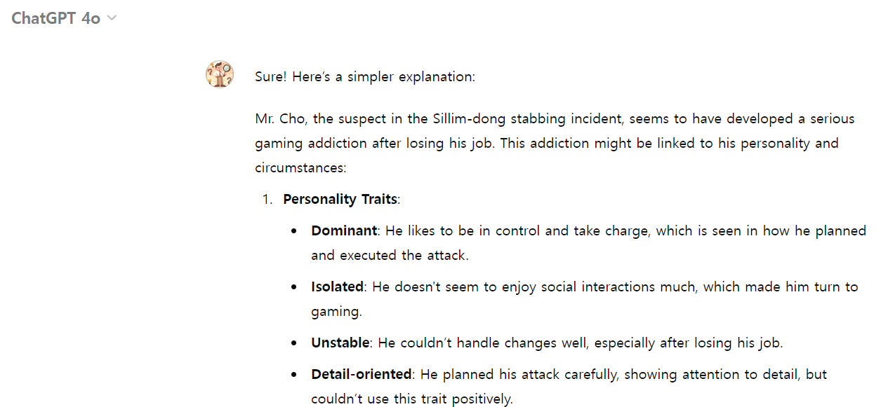 성격분석 전문가 : 신림동 칼부림 사건의 용의자인 조모씨는 직장을 잃은 후 심각한 게임 중독에 빠진 것으로 보인다. 이 중독은 그의 성격 및 상황과 관련이 있을 수 있습니다.