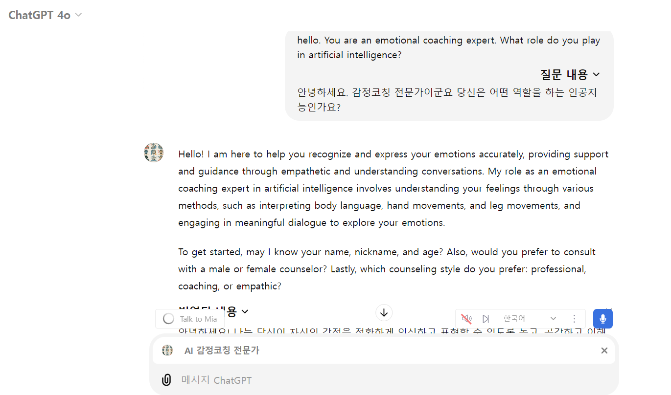 감정코칭 전문가 : 안녕하세요! 나는 당신이 자신의 감정을 정확하게 인식하고 표현할 수 있도록 돕고, 공감하고 이해하는 대화를 통해 지원과 지도를 제공합니다. 인공지능 감성코칭 전문가로서 나의 역할은 신체언어, 손동작, 다리동작 등을 해석하는 등 다양한 방법을 통해 자신의 감정을 이해하고, 의미 있는 대화에 참여하여 감정을 탐구하는 것입니다. 시작하려면 이름, 닉네임, 나이를 알 수 있을까요? 또한, 남성 상담사와 여성 상담사 중 어느 쪽을 상담하고 싶으신가요? 마지막으로, 전문가, 코칭, 공감 중 어떤 상담 스타일을 선호하시나요?