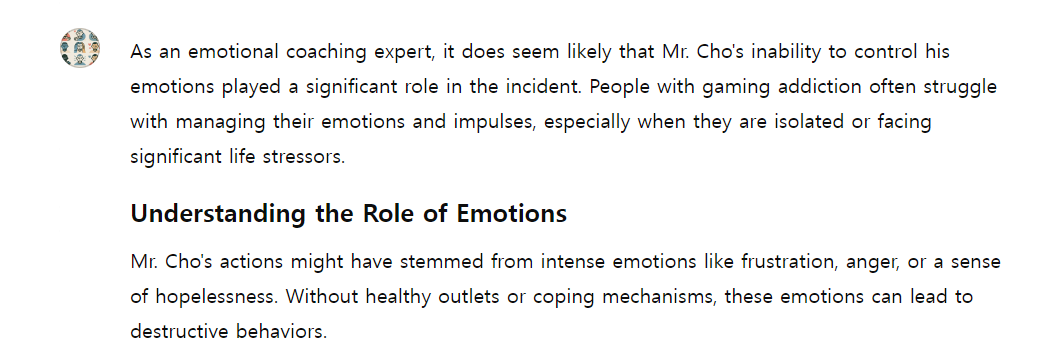 감정조절 전문가 : 감정 코칭 전문가로서, 조씨의 감정을 통제하지 못하는 것이 이 사건에서 중요한 역할을 했을 가능성이 있는 듯합니다. 게임 중독이 있는 사람들은 종종 감정과 충동을 조절하는 데 어려움을 겪습니다. 특히 고립되어 있거나 상당한 삶의 스트레스에 직면해 있을 때 더욱 그렇습니다.