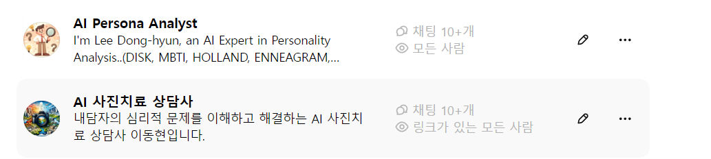각각의 인공지능의 지정한 후 자기소개를 요청합니다. gpt 초기화면 입니다. 프롬프트창에서 위의 인공지능들을 불러온 후 각자의 인공지능이 어떤 역할을 하는지 물어보는 시간입니다.