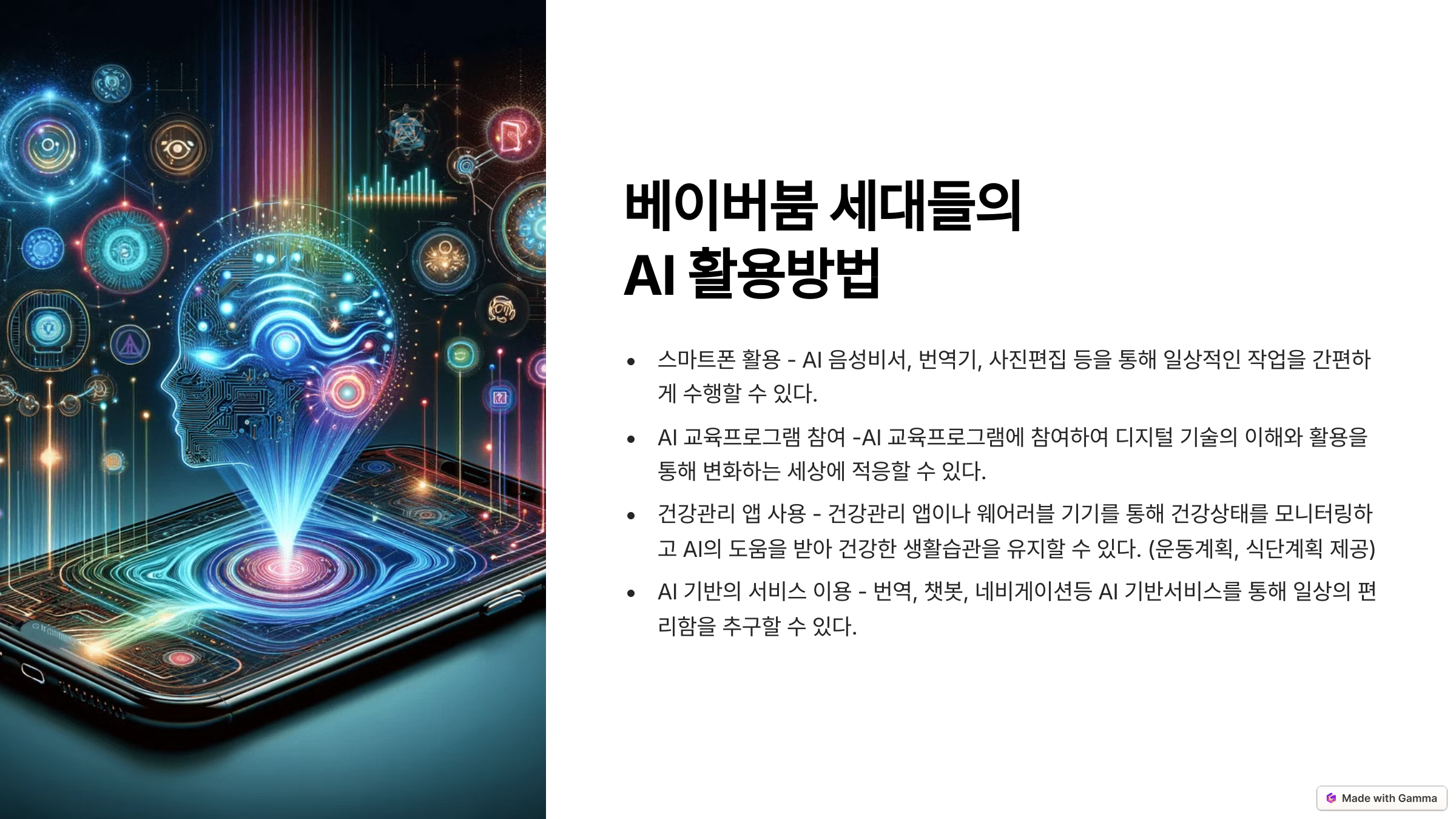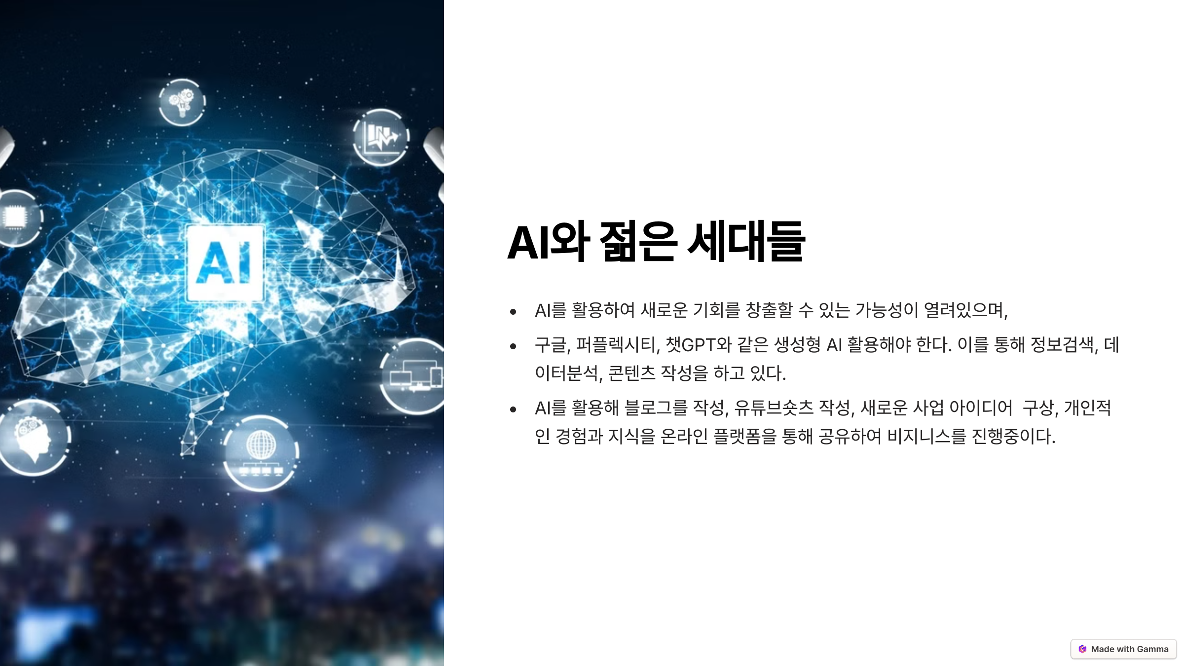 첨부된 이미지는 이번 강의의 주요 내용을 담은 강의안으로, 강의에서는 이보다 더 깊이 있는 실전 활용법을 알려드릴 예정입니다. 블로그 독자분들도 강의를 통해 AI가 여러분의 두 번째 인생에 어떻게 실질적인 힘이 되어줄 수 있을지 꼭 확인해보시기 바랍니다.