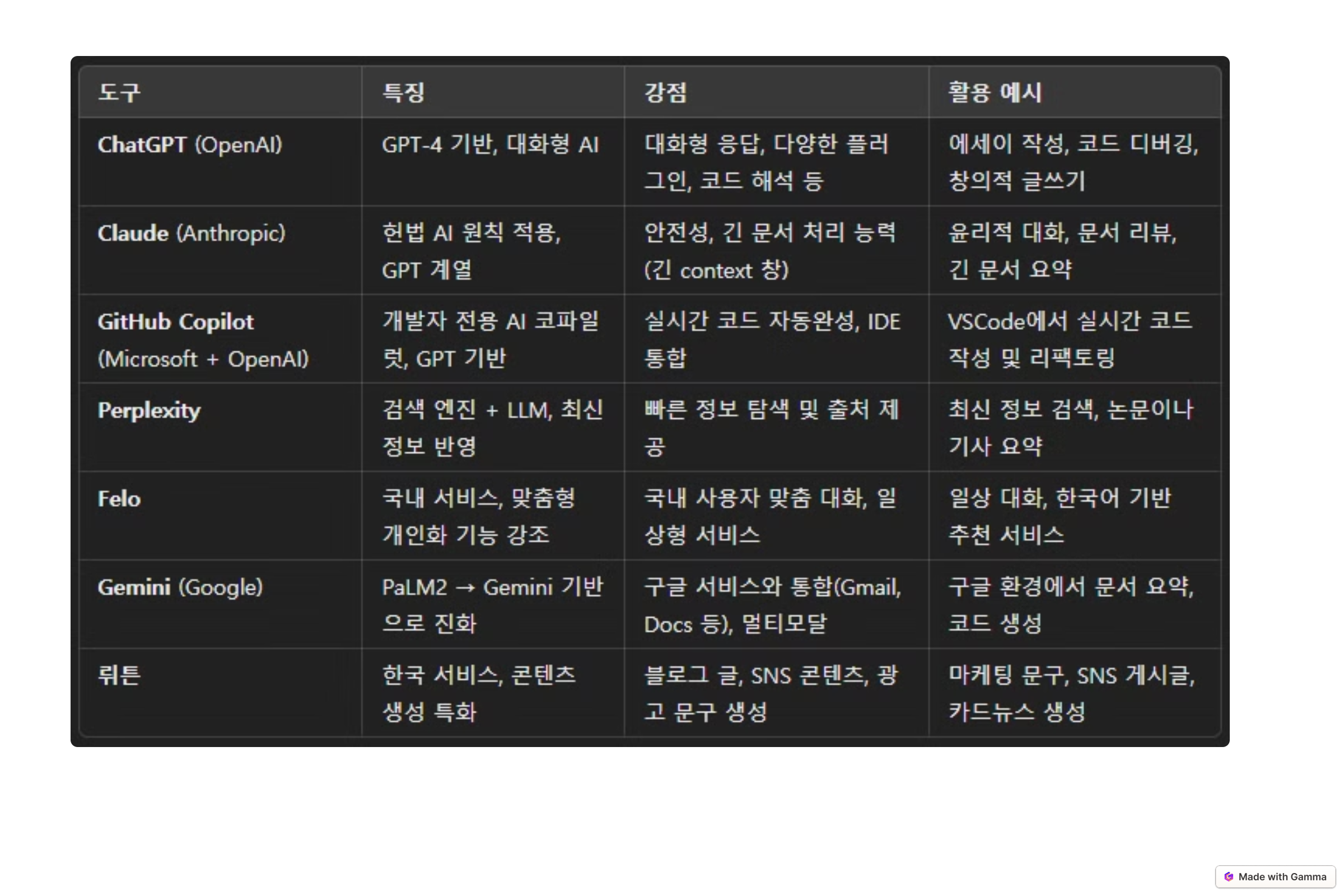 최근 등장한 다양한 AI 서비스들은 우리가 생각하는 것 이상으로 친근하고, 또 실용적입니다. 대표적으로 ChatGPT, Claude, GitHub Copilot, Perplexity, Gemini, Felo, 뤼튼과 같은 도구들이 있는데요, 이름만 들어도 다소 낯설게 느껴지실 수 있습니다. 하지만 이 AI들은 퇴직 후에도 충분히 활용할 수 있는 ‘새로운 업무 파트너’입니다.